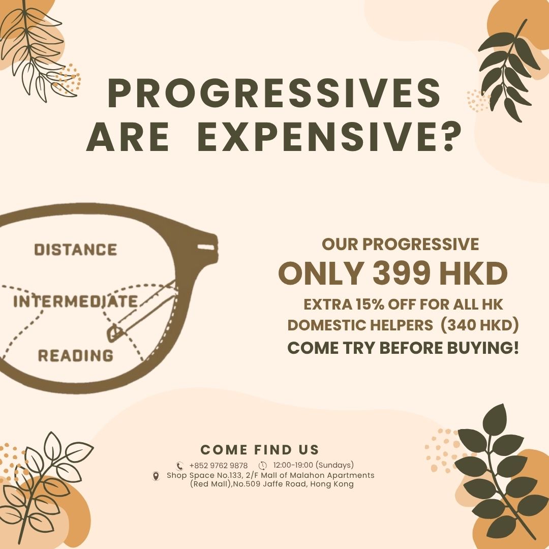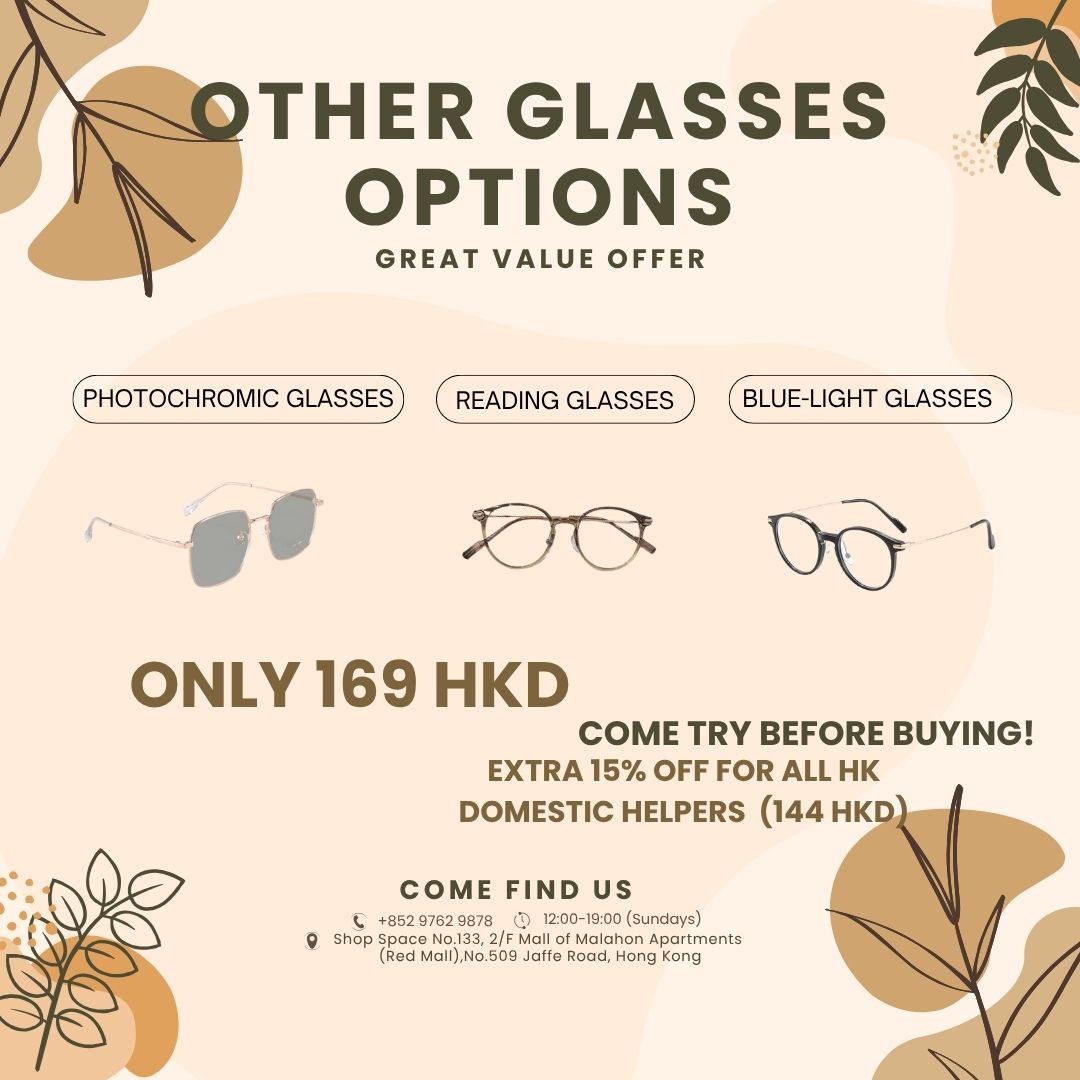 If Progressive is not for you, we also offer photochromic glasses, reading glasses, and blue light glasses!